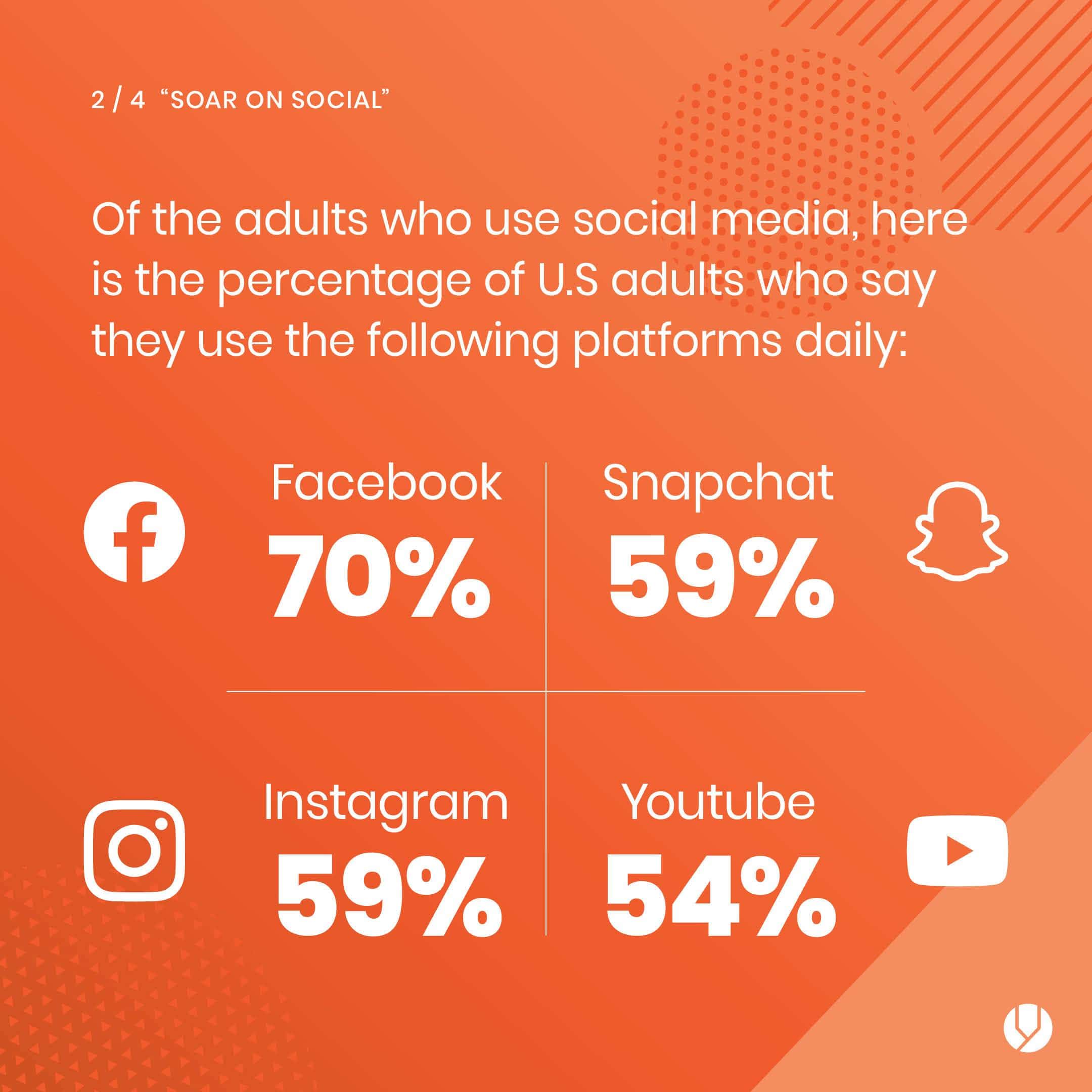 - Facebook: 70%; Snapchat: 59%; Instagram; 59%; Youtube; 54%
